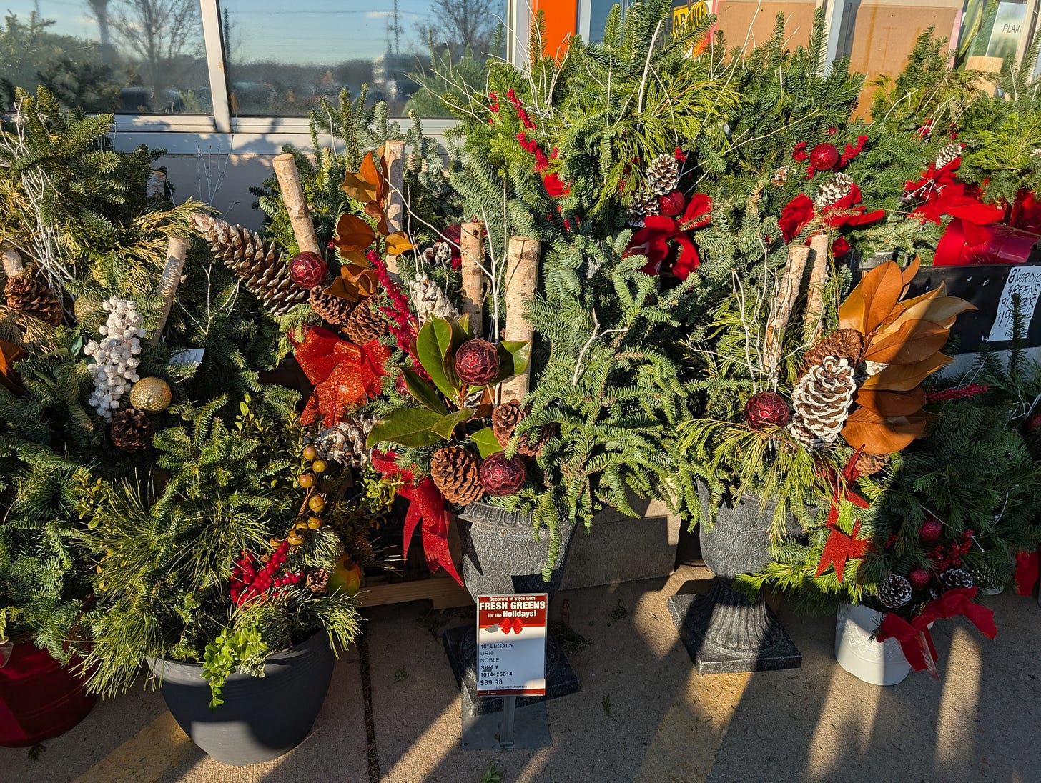 For instance, take a look at these beautiful seasonal arrangements below — they are all the rage in my neighborhood every December. There are houses nearby with 5 or 6 of these lining their front porch and driveway. They add a gorgeous touch of holiday cheer! I totally get it.