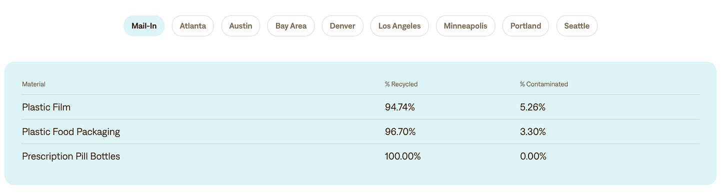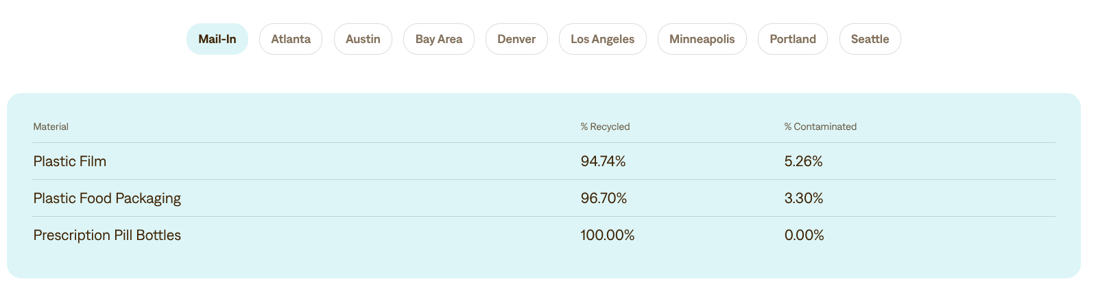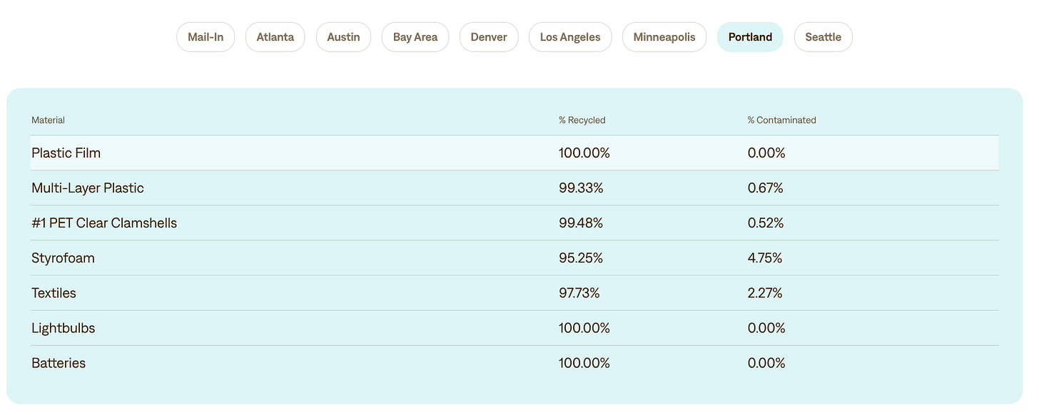 They *even* have a really fun and super transparent dashboard that shows you how much of what you send in actually gets recycled — including breakdowns by city. (How cool is this?! I love a good dashboard.)