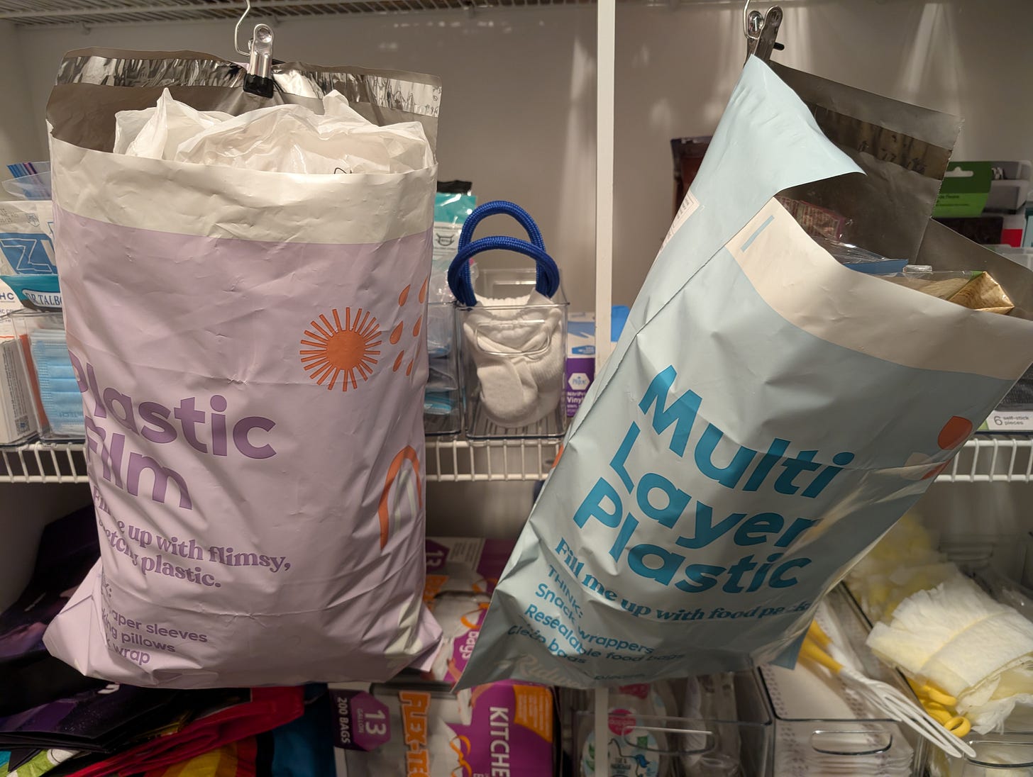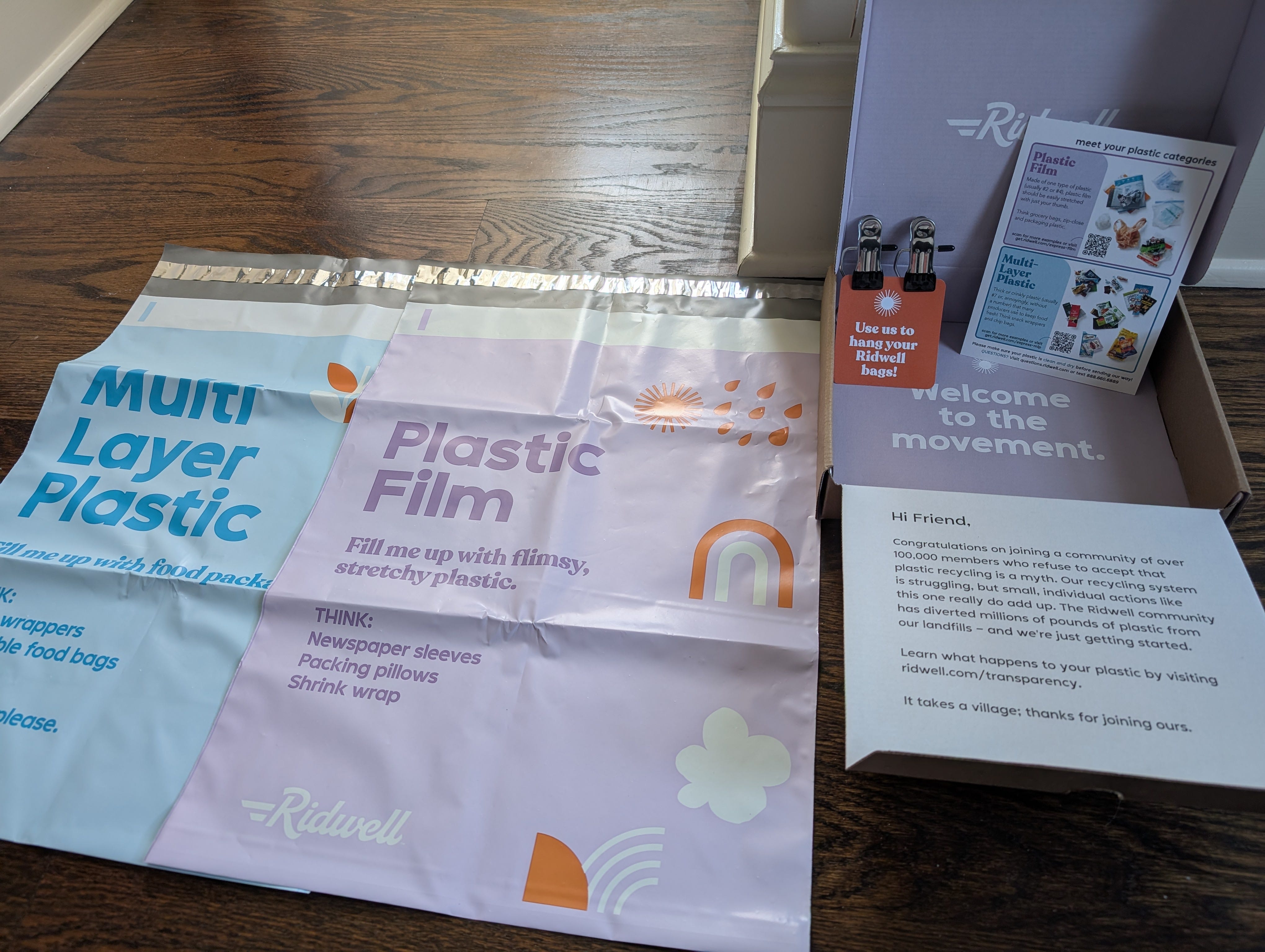 When you start out with Ridwell Mail-In, you receive a starter pack ($30) that includes a Plastic Film bag, a Multi-Layer Plastic bag, two hanging bag clips, and some handy instructions with examples of what goes in which bag.