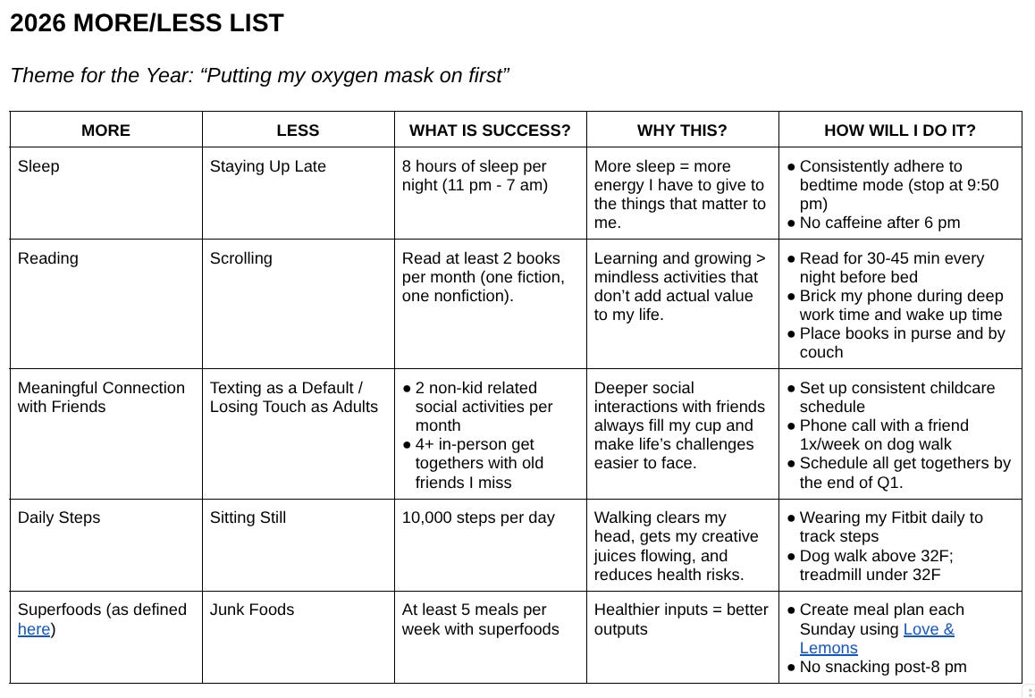 ✅ Scale back to the most critical. Last year’s list had nine rows. This year’s has five. As you create yours, think about which ones are most important. In other words, which ones will have the biggest asymmetric effect on your life if you get them right?