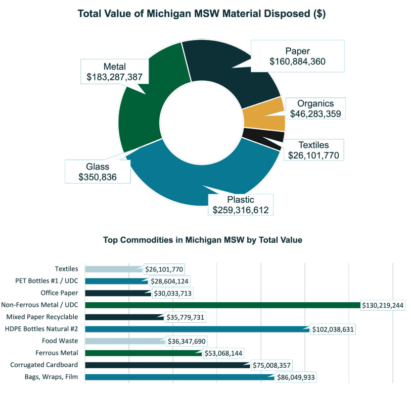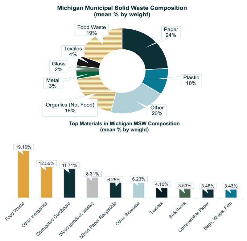 To illustrate this, A 2024 report by the Michigan Sustainable Business Forum included a chart that breaks down the state’s waste by material (Note: MSW = municipal solid waste). This is Michigan data, but let’s safely assume it’s fairly representative of other states.